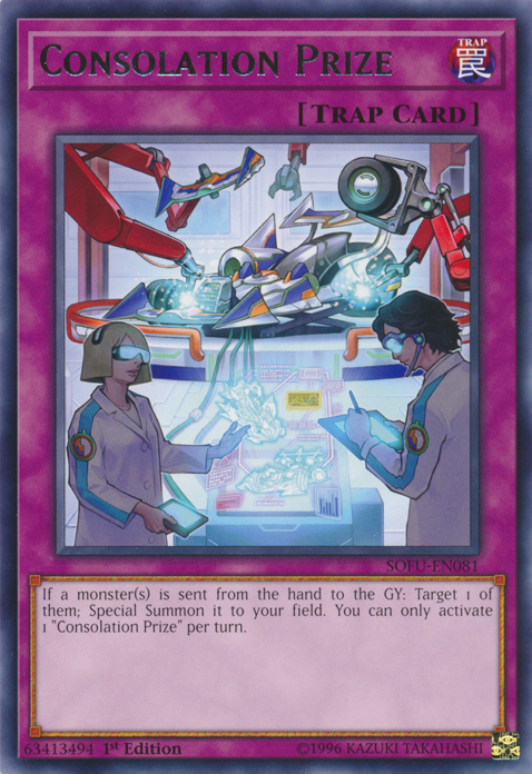 If a monster(s) is sent from the hand to the GY: Target 1 of them; Special Summon it to your field. You can only activate 1 "Consolation Prize" per turn.