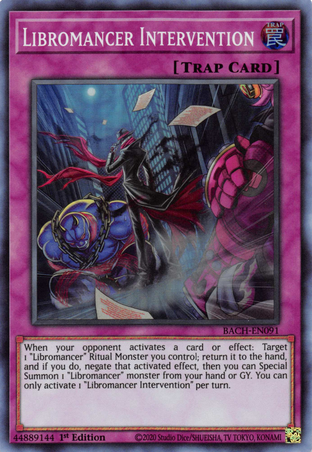 When your opponent activates a card or effect: Target 1 "Libromancer" Ritual Monster you control; return it to the hand, and if you do, negate that activated effect, then you can Special Summon 1 "Libromancer" monster from your hand or GY. You can only activate 1 "Libromancer Intervention" per turn.