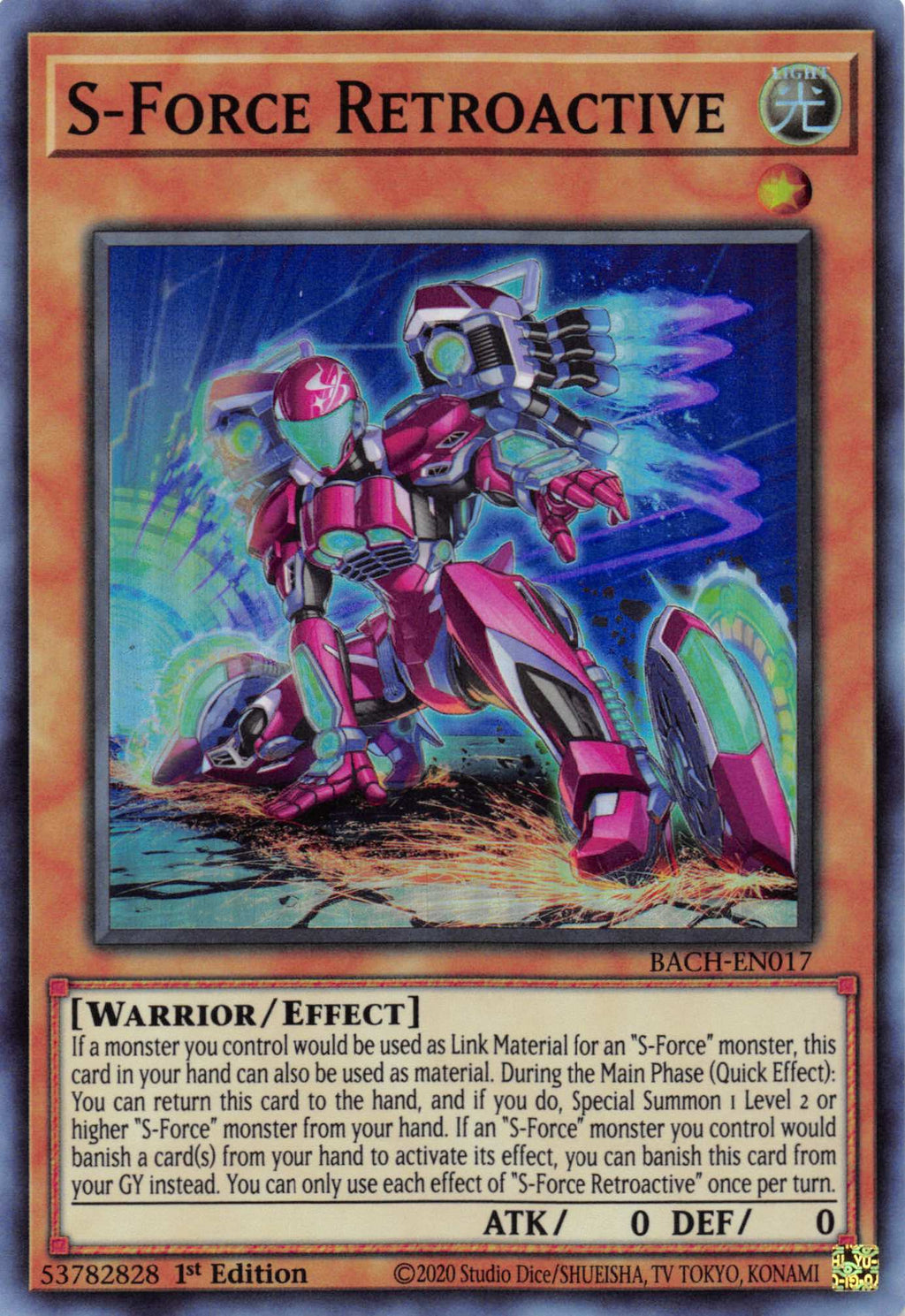 If a monster you control would be used as Link Material for an "S-Force" monster, this card in your hand can also be used as material. During the Main Phase (Quick Effect): You can return this card to the hand, and if you do, Special Summon 1 Level 2 or higher "S-Force" monster from your hand. If an "S-Force" monster you control would banish a card(s) from your hand to activate its effect, you can banish this card from your GY instead. You can only use each effect of "S-Force Retroactive" once per turn.