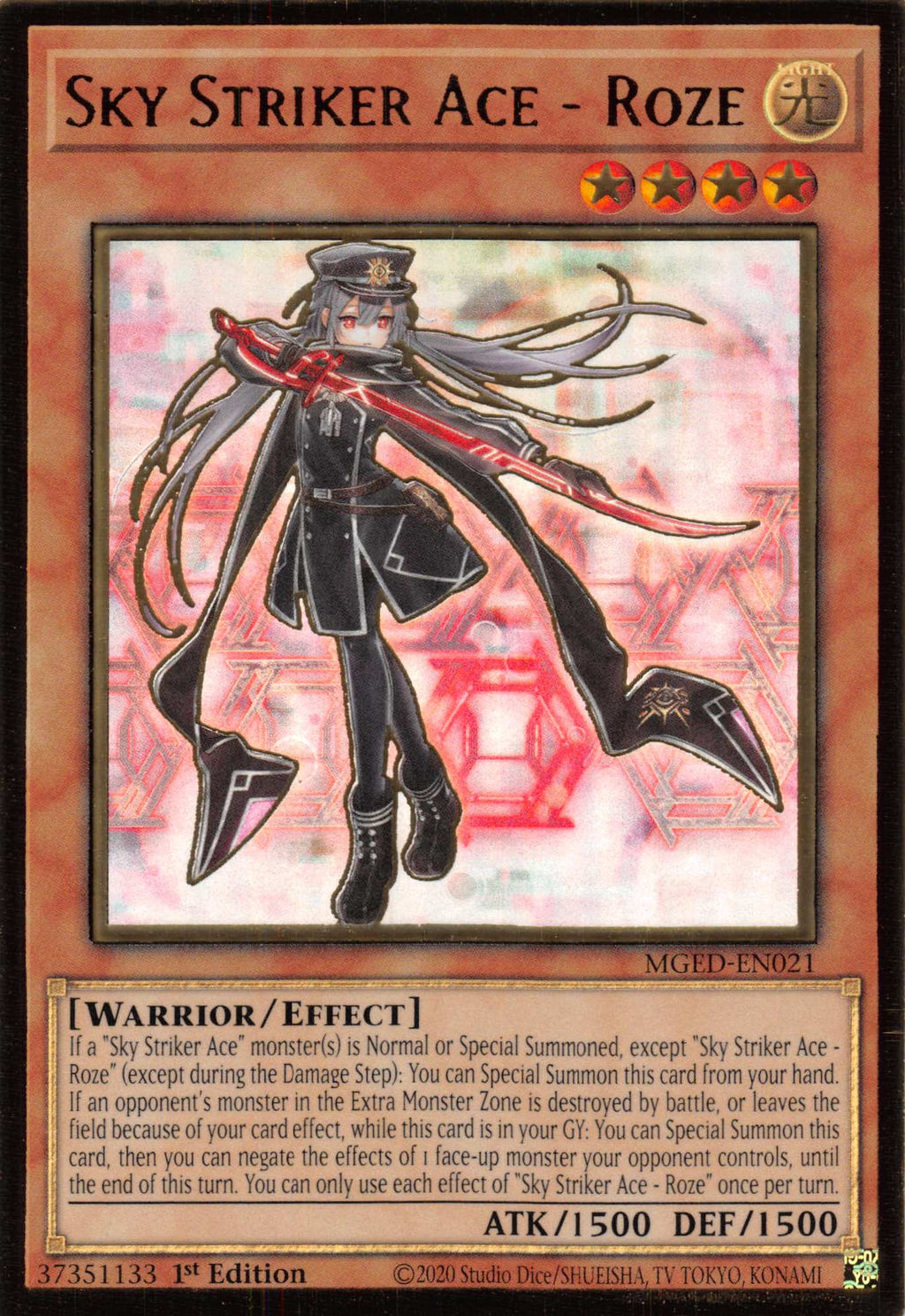 If a "Sky Striker Ace" monster(s) is Normal or Special Summoned, except "Sky Striker Ace - Roze" (except during the Damage Step): You can Special Summon this card from your hand. If an opponent's monster in the Extra Monster Zone is destroyed by battle, or leaves the field because of your card effect, while this card is in your GY: You can Special Summon this card, then you can negate the effects of 1 face-up monster your opponent controls, until the end of this turn. You can only use each effect of "Sky Striker Ace - Roze" once per turn.
