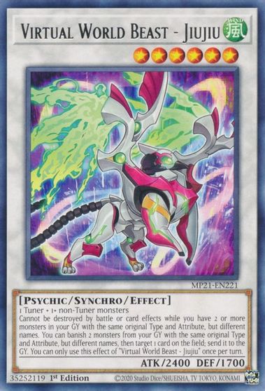 Cannot be destroyed by battle or card effects while you have 2 or more monsters in your GY with the same original Type and Attribute, but different names. You can banish 2 monsters from your GY with the same original Type and Attribute, but different names, then target 1 card on the field; send it to the GY. You can only use this effect of "Virtual World Beast - Jiujiu" once per turn.