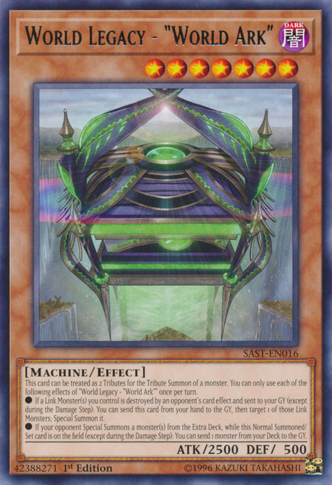 This card can be treated as 2 Tributes for the Tribute Summon of a monster. You can only use each of the following effects of "World Legacy - "World Ark"" once per turn.
