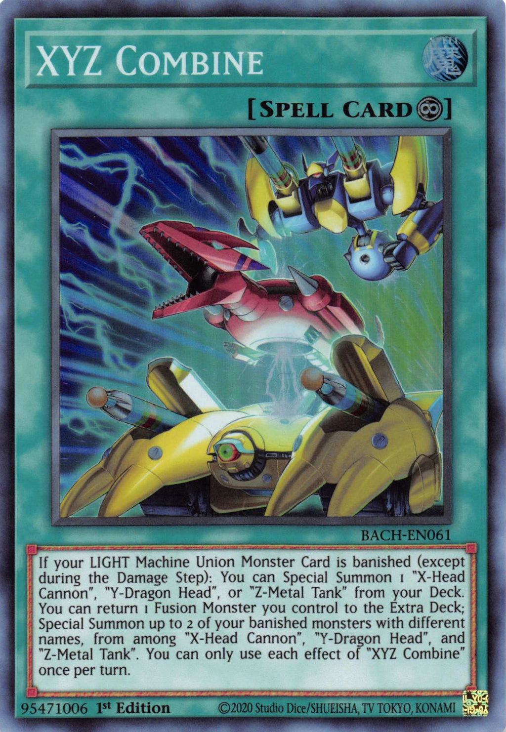 If your LIGHT Machine Union Monster Card is banished (except during the Damage Step): You can Special Summon 1 "X-Head Cannon", "Y-Dragon Head", or "Z-Metal Tank" from your Deck. You can return 1 Fusion Monster you control to the Extra Deck; Special Summon up to 2 of your banished monsters with different names, from among "X-Head Cannon", "Y-Dragon Head", and "Z-Metal Tank". You can only use each effect of "XYZ Combine" once per turn.